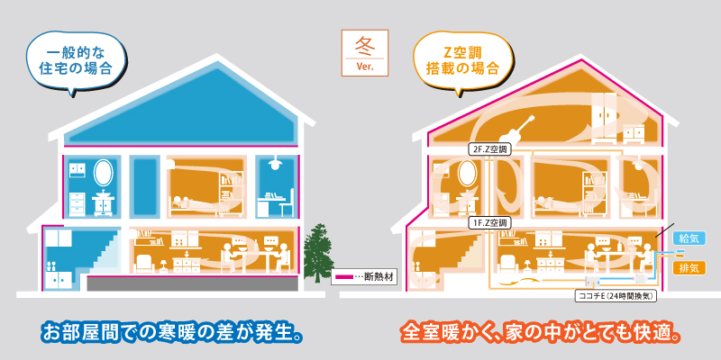 玄関からお手洗いまで空調が行き届くため、LDKを出ても快適。夏の部屋着のまま冬を迎えられます。Z空調のある暮らしなら“冬や夏”が好きになれます。