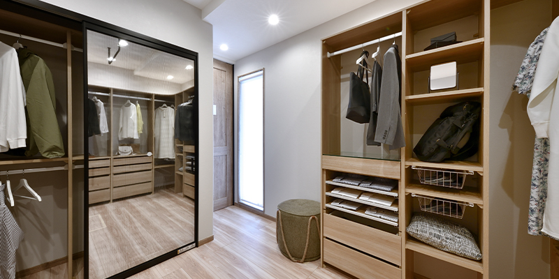 まるで衣裳部屋のような収納空間の鏡面式の扉でその日の衣装合わせ。パイプや引き出し、小物入れなど多様な収納が魅力的。オシャレ好きな方には喜ばれる一部屋です。