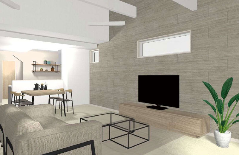 リビング上部は他の部屋に比べて天井を高く設計しており、目線が拡がり開放感を感じられます。また、リビングには他の部屋へのドアがないので人の行き来が極めて少なく、落ち着いて過ごすことができます。