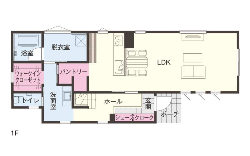 玄関・LDK・水周りをぐるりと1周できます。行き来の往復移動が少なく、目的の場所まで最短距離で移動できるなど移動距離と移動時間を大幅にカット。日々の「家事ラク」をサポートしてくれます。