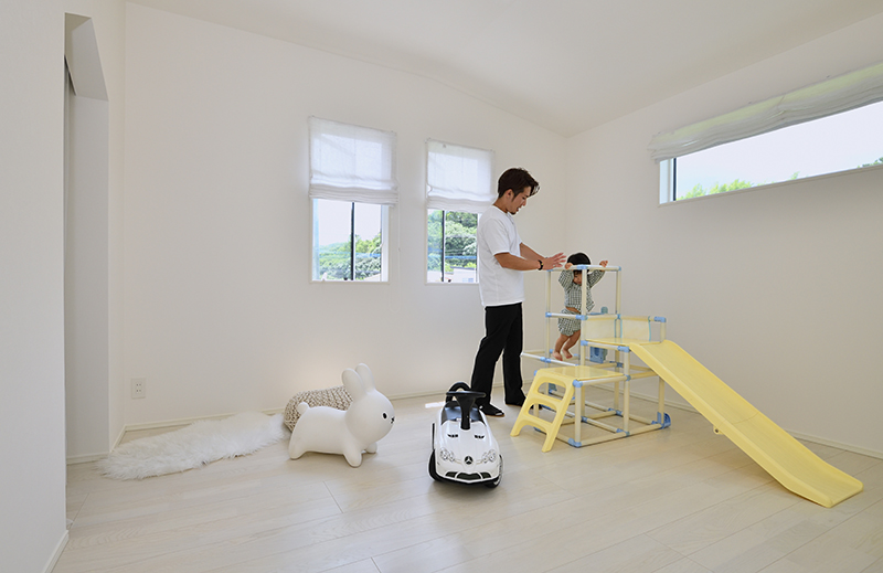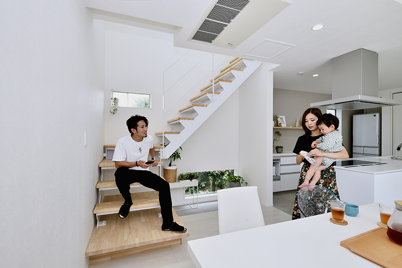抜ける目線を創る吹抜けと高窓から注ぐ光、白を基調としたリビング空間。面積以上に部屋を広く感じさせてくれる仕掛けがいっぱい。