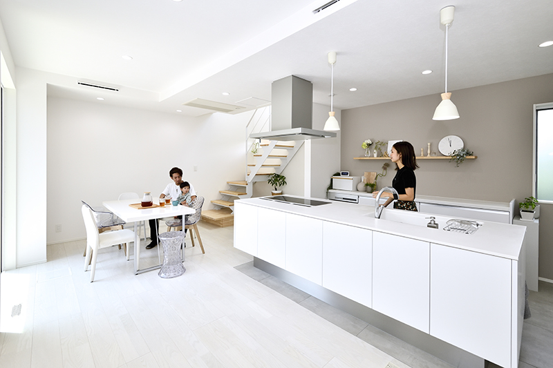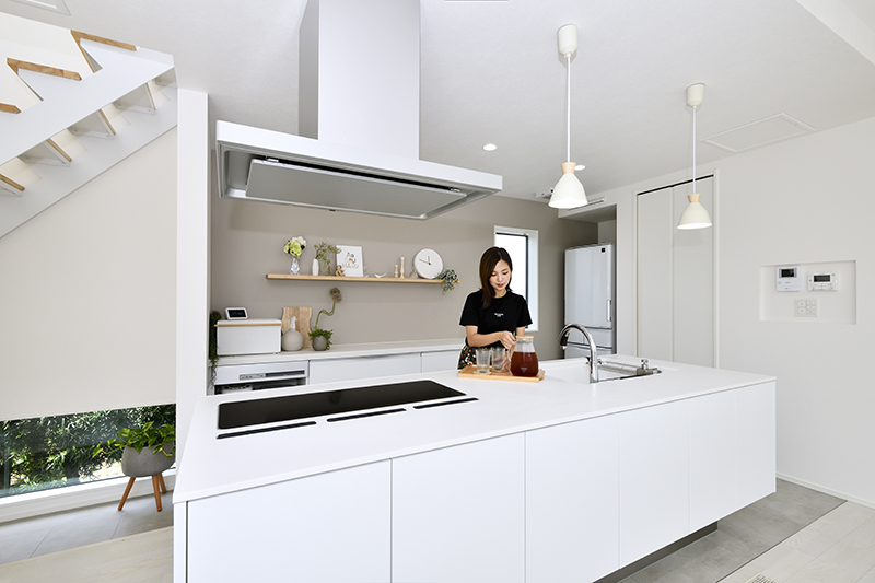 シンプルデザインですっきりしたアイランドキッチンに合わせ、家電や冷蔵庫は格納し生活感を極力抑えた造りに。木製の棚はインテリア用。