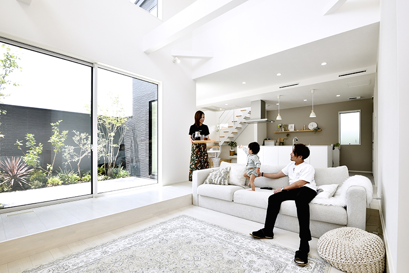玄関ドアを開けるとFIX窓越しに見える中庭が壮観。収納にはウォークインタイプの土間を完備。全館空調システム「Z空調」が玄関ドアを開けた瞬間から快適空間でお出迎え。